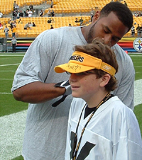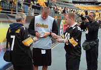 Ben Roethlisberger was out on the field working with a coach. Mike gave me some advice on what time Big Ben would be leaving the warm up as Ben quite often signed autographs. Hines Ward and Jerome Bettis were quite happy to accommodate their fans, even posing with them for photos.